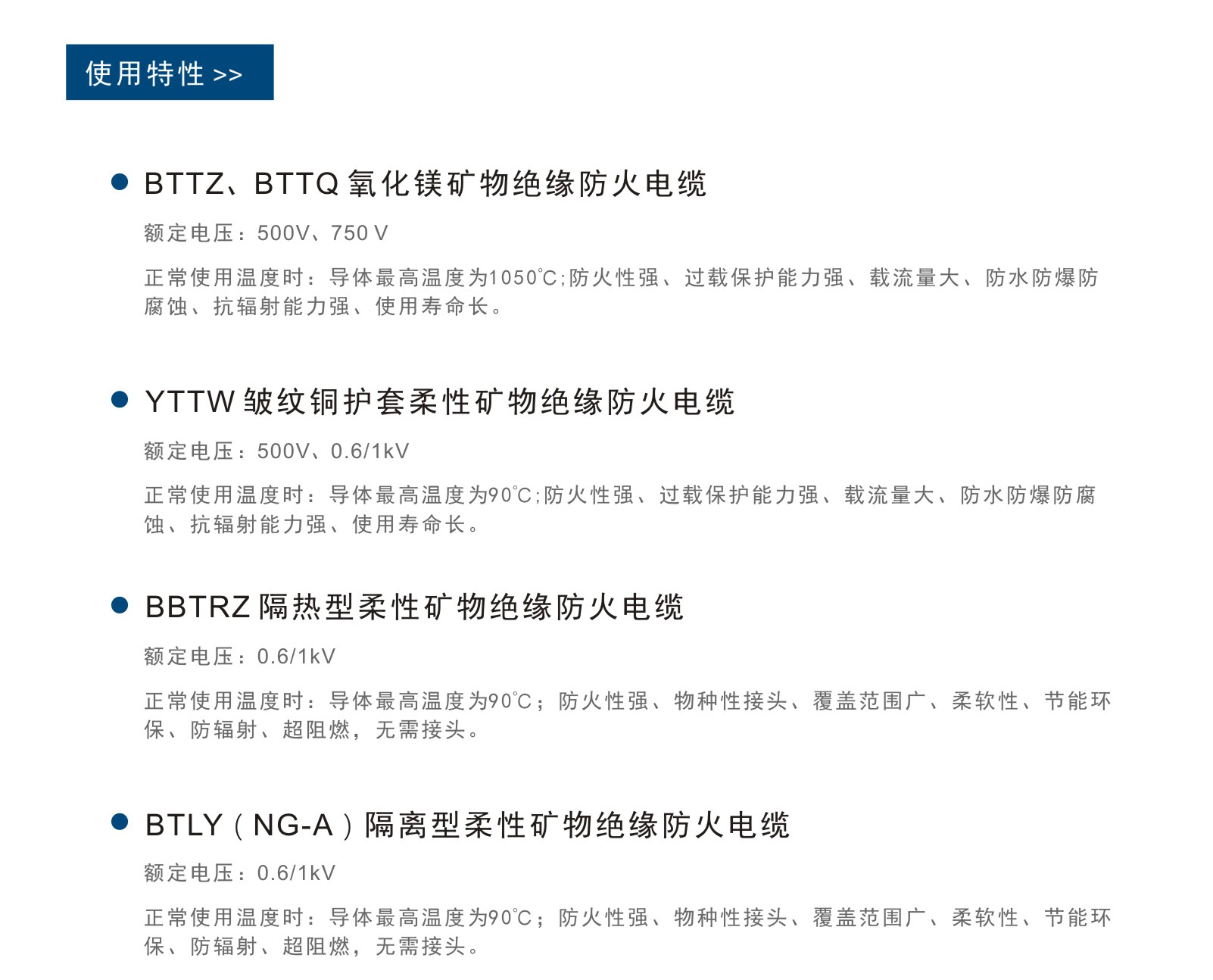 具有良好的耐火、耐高温、载流量大、防水、耐腐蚀、耐机械损伤、耐辐照及电磁相容性、美观大方等特点,同时该电缆在火灾条件下不会放出任何烟雾、卤素及有毒有害气体。