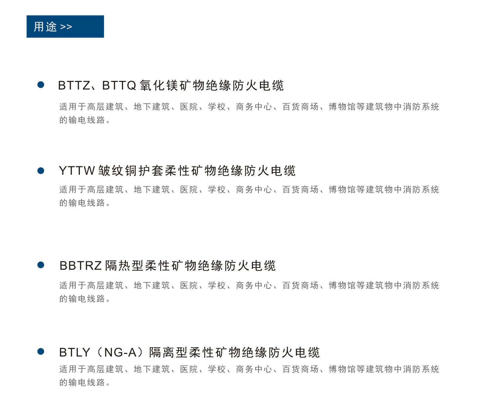 主要应用于主干线路、消防线路、逃生救援系统,如应急照明、火灾监测、报警系统、电梯系统、排烟系统,以及控制线路等。