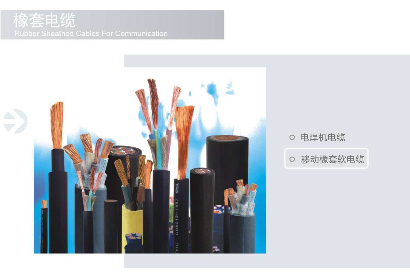 橡套电缆是由多股的细铜丝为导体,外包橡胶绝缘和橡胶护套的一种柔软可移动的电缆。 主要型号:YQ、YQW、YZ、YZW、YC、YCW、YH、YHF。包括通用橡套软电缆、电焊机电缆、潜水电机电缆等品种。